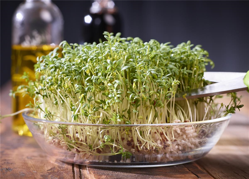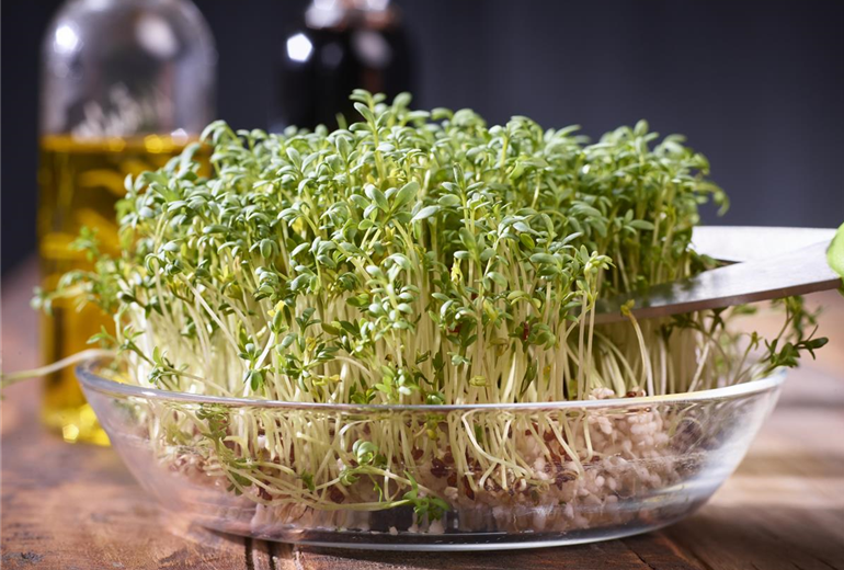 Grünsprossen, auch Microgreens genannt, sind momentan der Trend in Sachen Superfood! Kein Wunder, sie bringen viel Geschmack und Vitamine auf den Teller. Im Gegensatz zu Keimsprossen, die komplett gegessen werden, werden die Mini-Keimlinge über den Wurzeln abgeschnitten. Zudem werden sie in Anzuchterde ausgesät. Saatgut von beispielsweise Radieschen, Senf, Koriander oder Salatrauke wird dafür dicht an dicht in einen mit Anzuchterde gefüllten Blumentopf oder Schale gefüllt. Das Saatgut vorsichtig andrücken und regelmäßig mit Wasser ansprühen. Für ein gleichmäßiges Klima wird Frischhaltefolie über das Gefäß gespannt, damit sich kein Schimmel bildet muss diese einmal am Tag entfernt werden. Schalen können auch mit feuchtem Zeitungspapier abgedeckt werden, sobald die Keimlinge das Papier hochdrücken, wird es abgenommen. An einem hellen und warmen Standort ohne direkte Sonneneinstrahlung kann anhängig von der Keimzeit der Sorte schon nach gut einer Woche mit der Ernte der herrlich würzig schmeckenden Grünsprossen begonnen werden.
