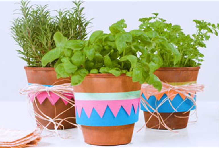 Leckere Kräuter gehören in jede Küche und verleihen zahlreichen Gerichten mit ihrem würzigen Geschmack eine besondere Note. Solange man sie noch nicht im Garten pflanzen kann, fühlen sich die Würzpflanzen auch auf der Fensterbank wohl. In bunt dekorierten Übertöpfen bringen Basilikum und Co. nicht nur Frische, sondern auch gute Laune in die Küche. Dazu braucht man nur etwas farbigen Tonkarton, Bast, Masking Tape, schlichte Tontöpfe und natürlich die eigenen Lieblingskräuter.